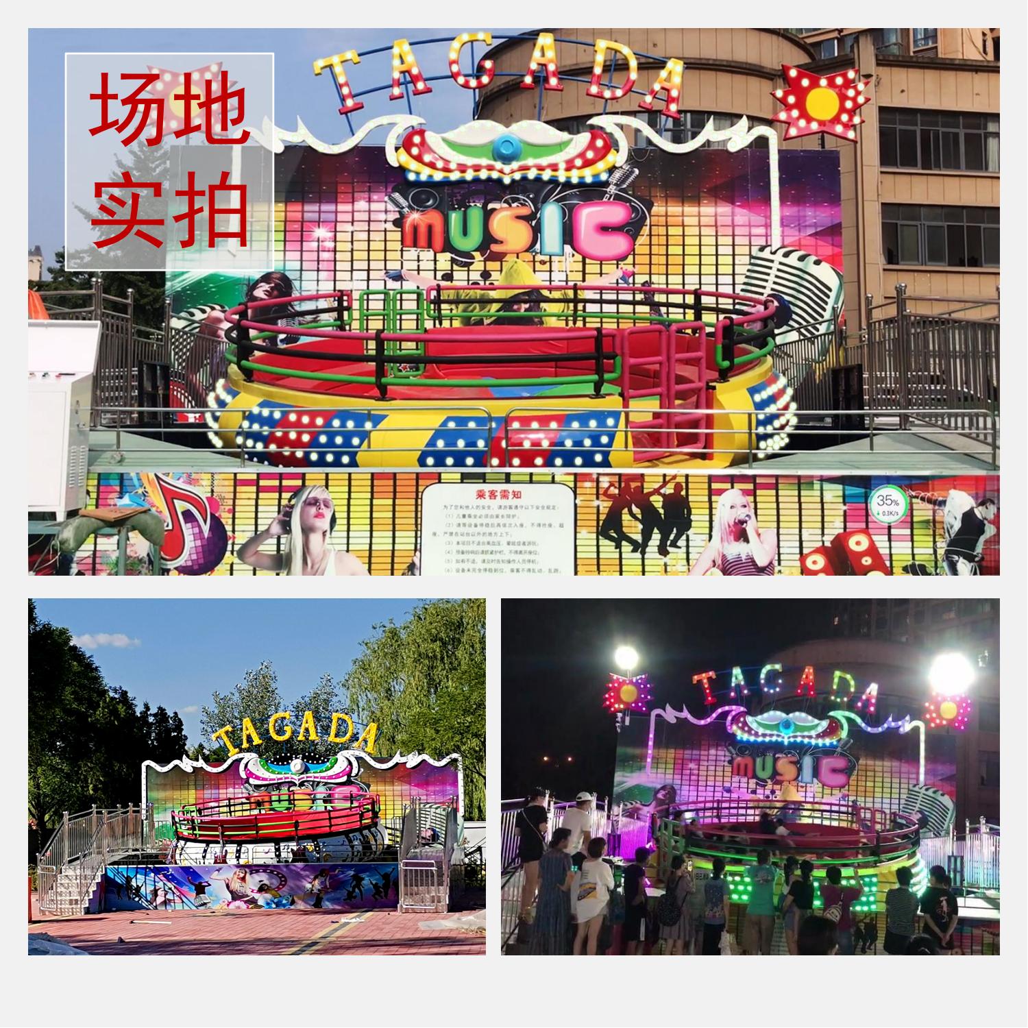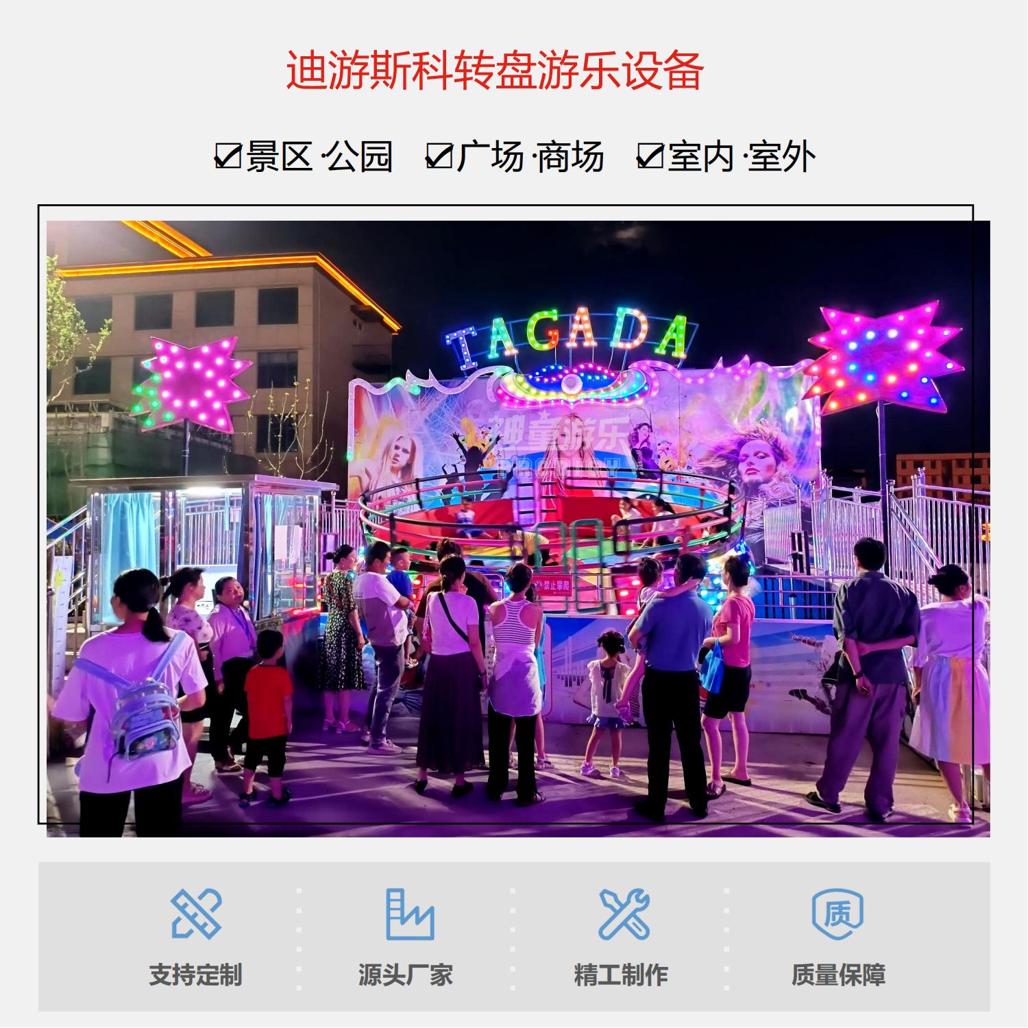 迪斯科轉盤是陀螺類高速回轉大型游樂設備,游客就在大圓盤上的沙發上圍坐成一周,伴隨富有節奏的音樂,身體隨著圓盤運動。設備運行中突然升起和降落,顛筋起伏,變化無窮,時快時慢,同時伴隨著強烈、震撼的迪斯高樂曲,使乘客感到自己婉如一個跳動的音符。