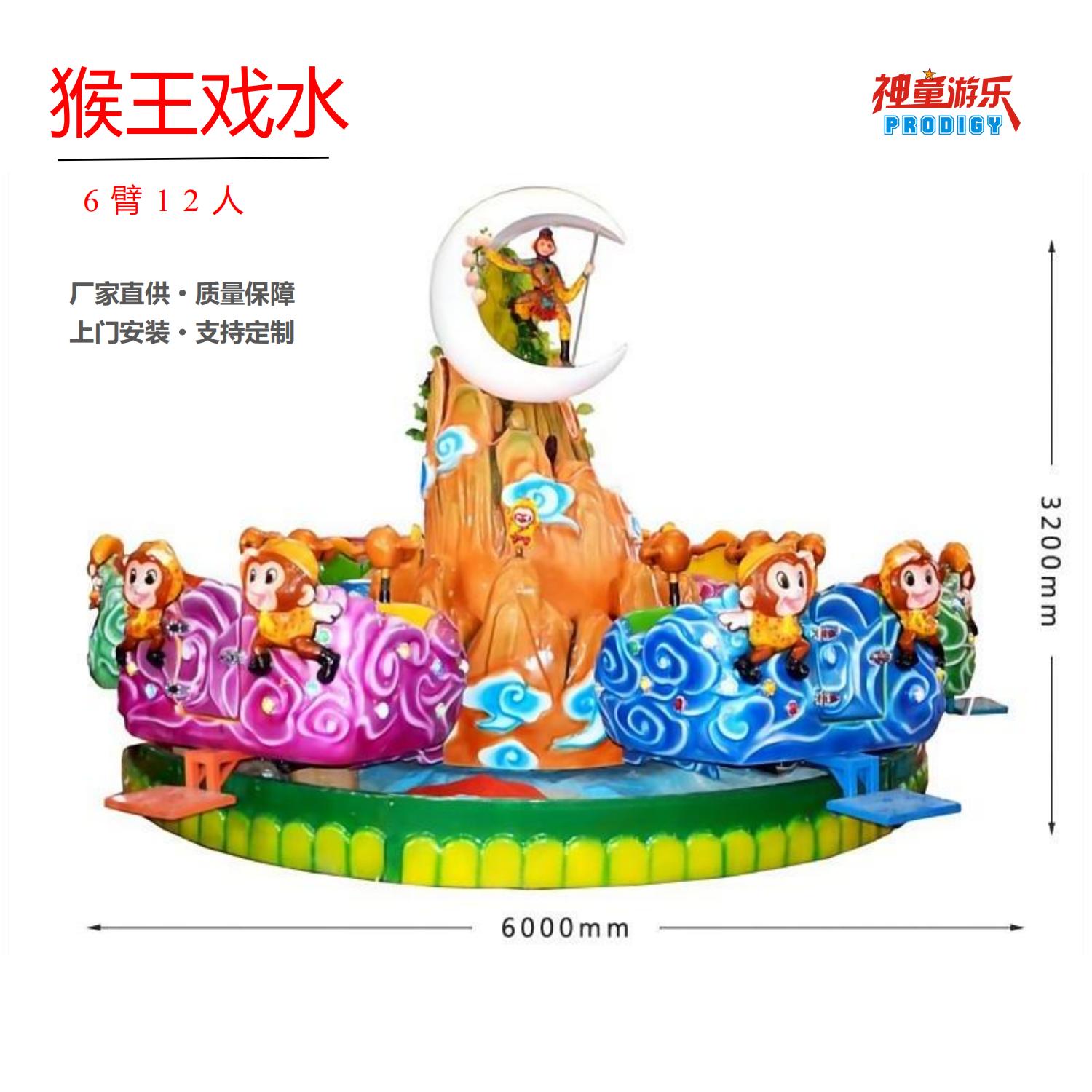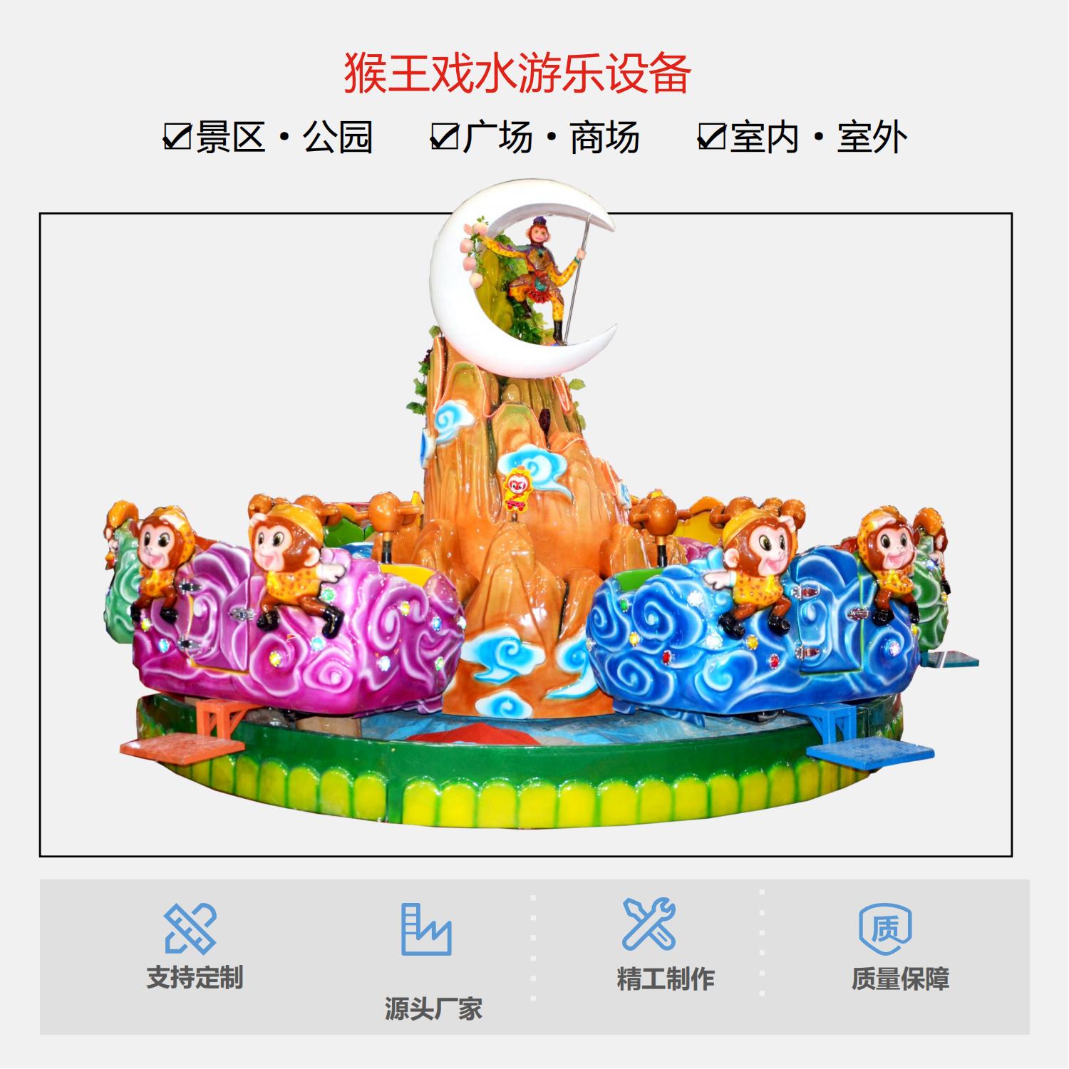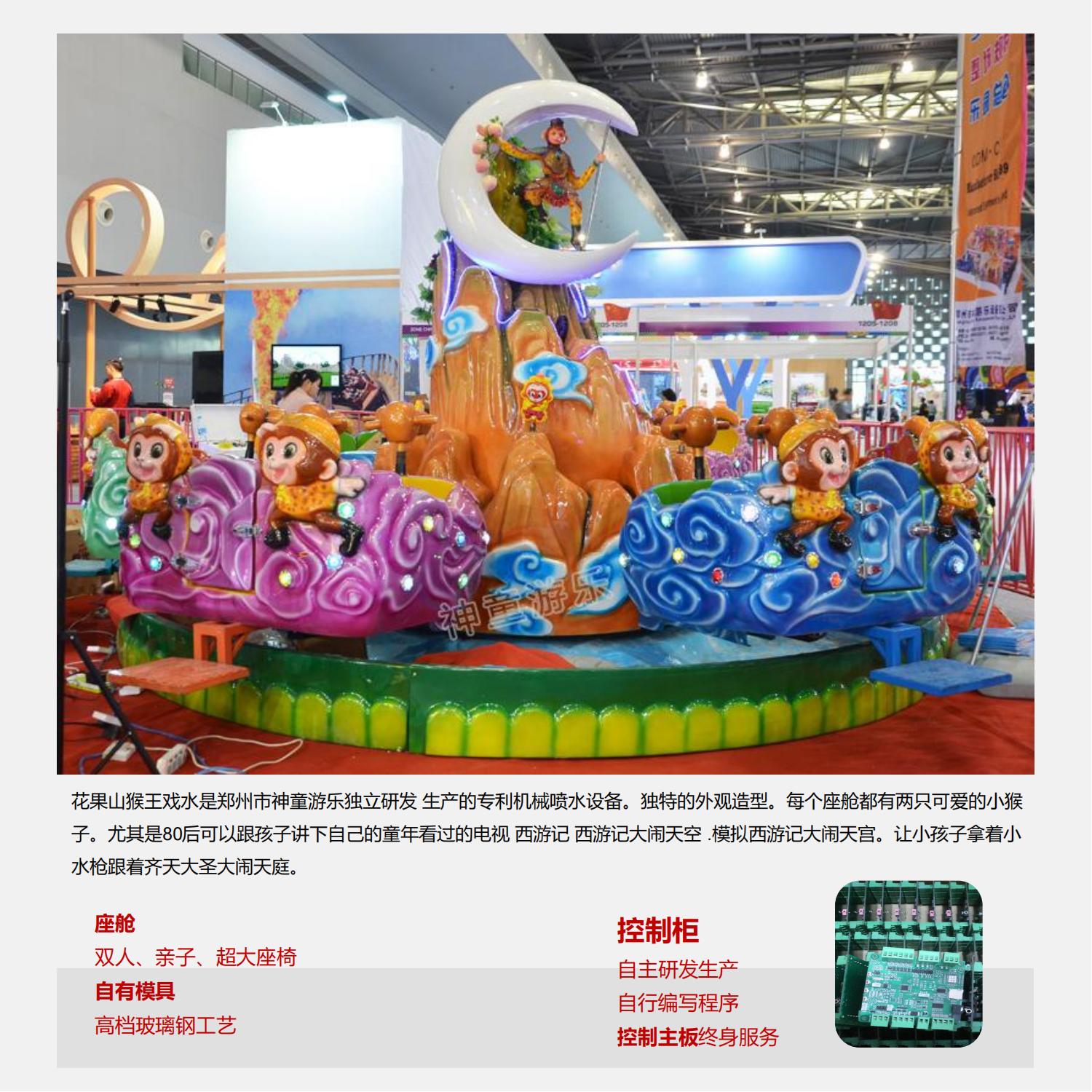 花果山猴王戲水是鄭州市神童游樂獨立研發 生產的專利機械噴水設備。獨特的外觀造型。每個座艙都有兩只可愛的小猴子。尤其是80后可以跟孩子講下自己的童年看過的電視,西游記,西游記大鬧天空 模擬西游記大鬧天官。讓小孩子拿著小水槍跟著齊天大圣大鬧天庭。