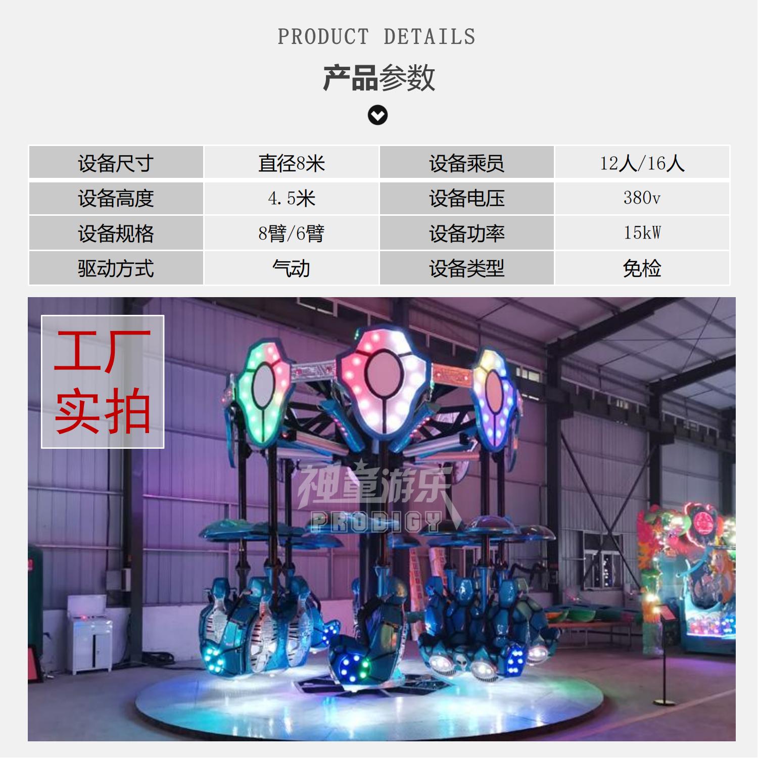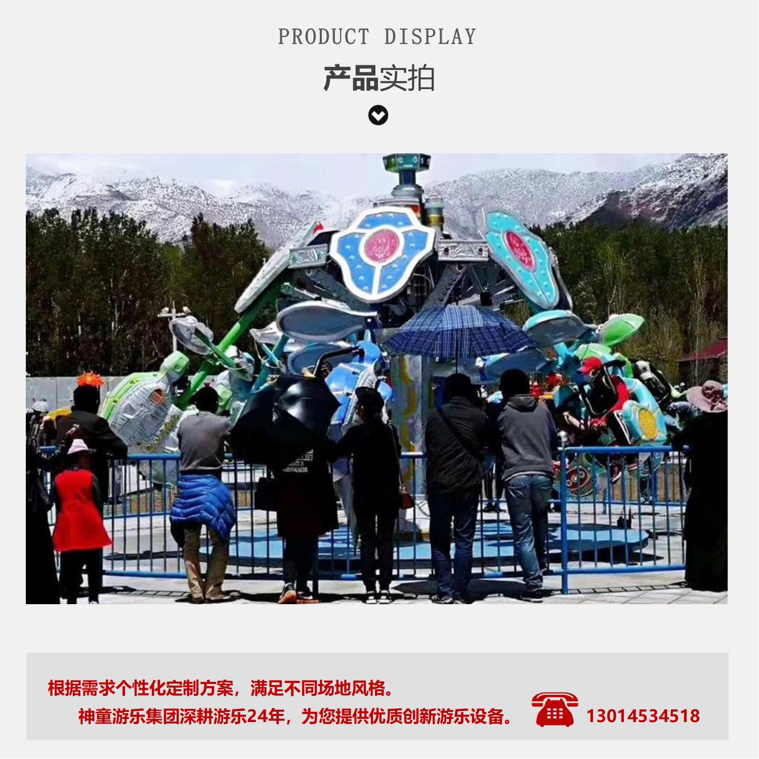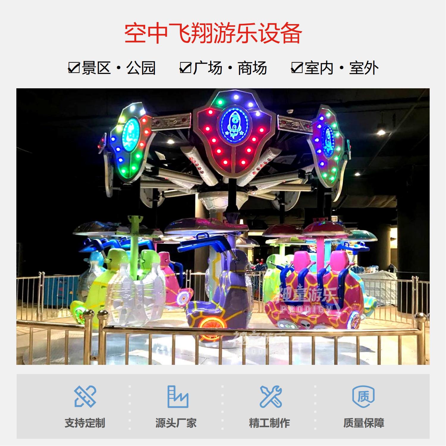 空中飛翔是由機械、氣動和電氣系統組成,是一種繞中心旋轉、離心向外運動的室內外中大型空中射擊旋轉升降類免檢游樂設備最新太空主題造型,當設備啟動后,設備便載著乘客旋轉起來,隨著音樂的節奏變快,座艙在氣缸的作用下有規律的向外彈跳,給乘客帶來前所未有的快感與刺激。