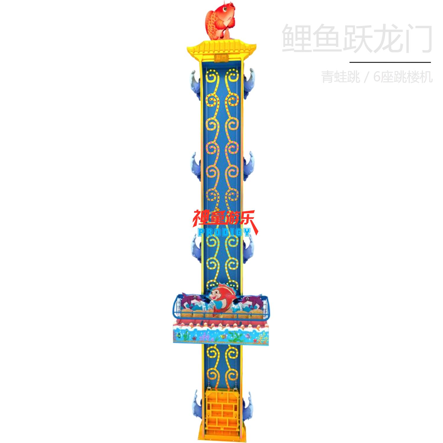 鯉魚躍龍門是一款青蛙跳設(shè)備,是屬于一種勻速升高、分段下降的游樂設(shè)備,設(shè)備配有六個座位。其主要結(jié)構(gòu)為龍門架,座椅油缸。操作人員待游客坐好后,扣好安全帶、桿,游客升高到一定高度,然后會跳躍式分段下降,猶如坐在大青蛙的背上蹦蹦跳跳的感覺。深受游客的喜歡,特別是青少年游客的喜愛。