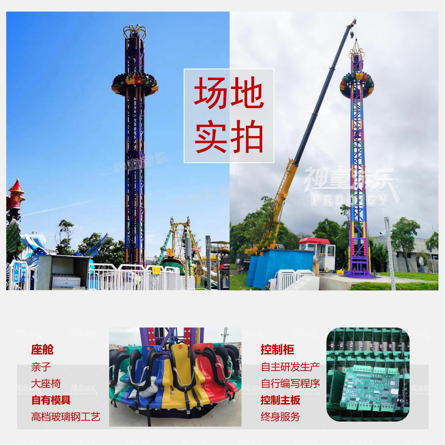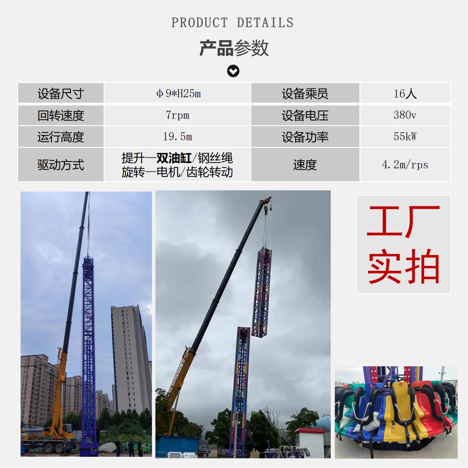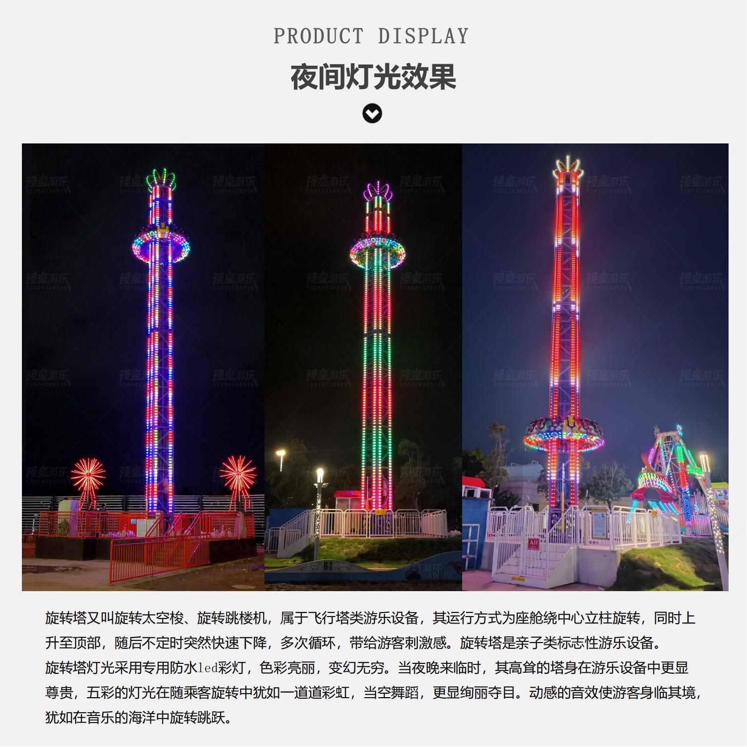 旋轉塔又叫旋轉太空梭、旋轉跳樓機,屬于飛行塔類游樂設備,其運行方式為座艙繞中心立柱旋轉,同時上升至頂部,隨后不定時突然快速下降,多次循環,帶給游客刺激感。旋轉塔是親子類標志性游樂設備。當夜晚來臨時,其高聳的塔身在游樂設備中更顯尊貴,五彩的燈光在隨乘客旋轉中猶如一道道彩虹,當空舞蹈,更顯絢麗奪目。動感的音效使游客身臨其境猶如在音樂的海洋中旋轉跳躍。
